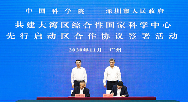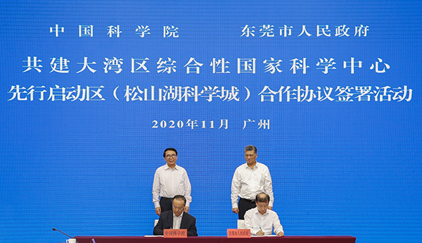 在白春禮、馬興瑞見證下,中科院副院長張濤分別與深圳市副市長艾學峰、東莞市市長肖亞非簽署《中國科學院深圳市人民政府共同建設綜合性國家科學中心先行啟動區合作協議》《中國科學院 東莞市人民政府共同建設綜合性國家科學中心先行啟動區(松山湖科學城)合作協議》。根據協議內容,院省雙方將充分發揮全面戰略合作優勢,以深圳光明科學城、深港科技創新合作區深圳園區、東莞松山湖科學城為載體,著力加強基礎與應用基礎研究、關鍵核心技術攻關和高水平創新平臺建設,推動全鏈條成果轉移轉化和人才集聚高地建設,服務粵港澳大灣區高質量發展,共同建設綜合性國家科學中心先行啟動區,為粵港澳大灣區國際科技創新中心建設打下堅實基礎。